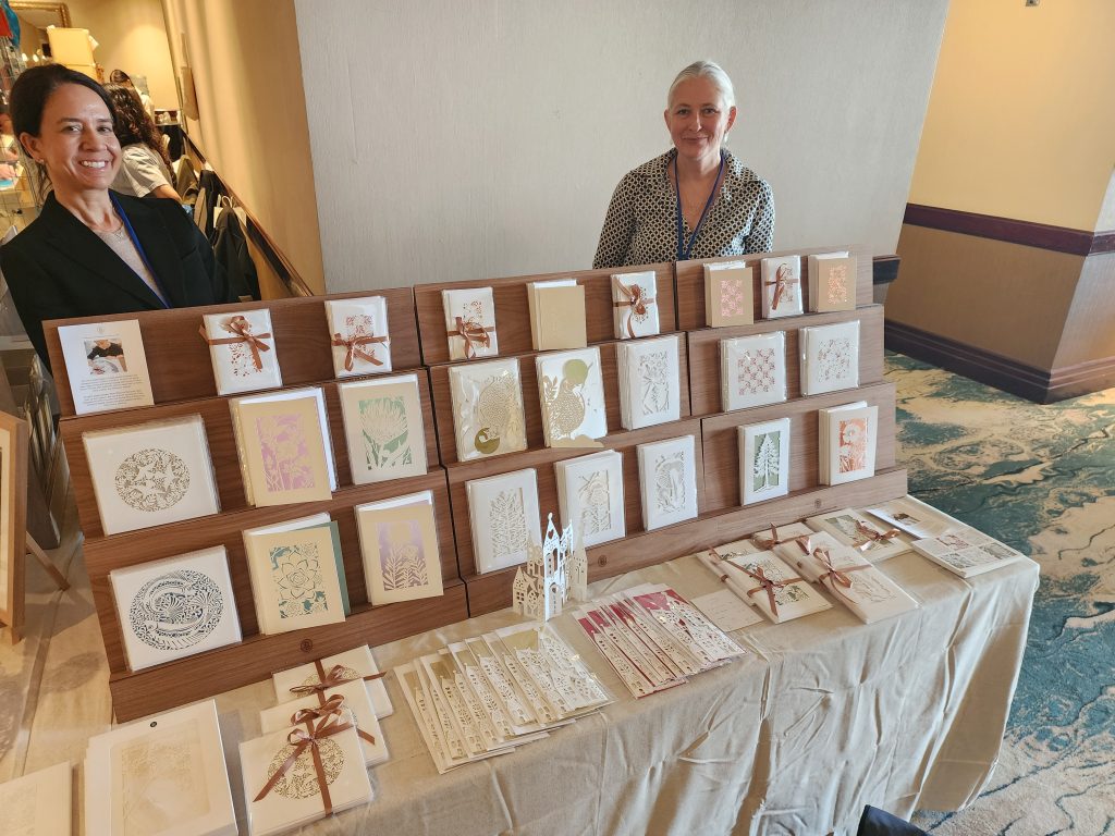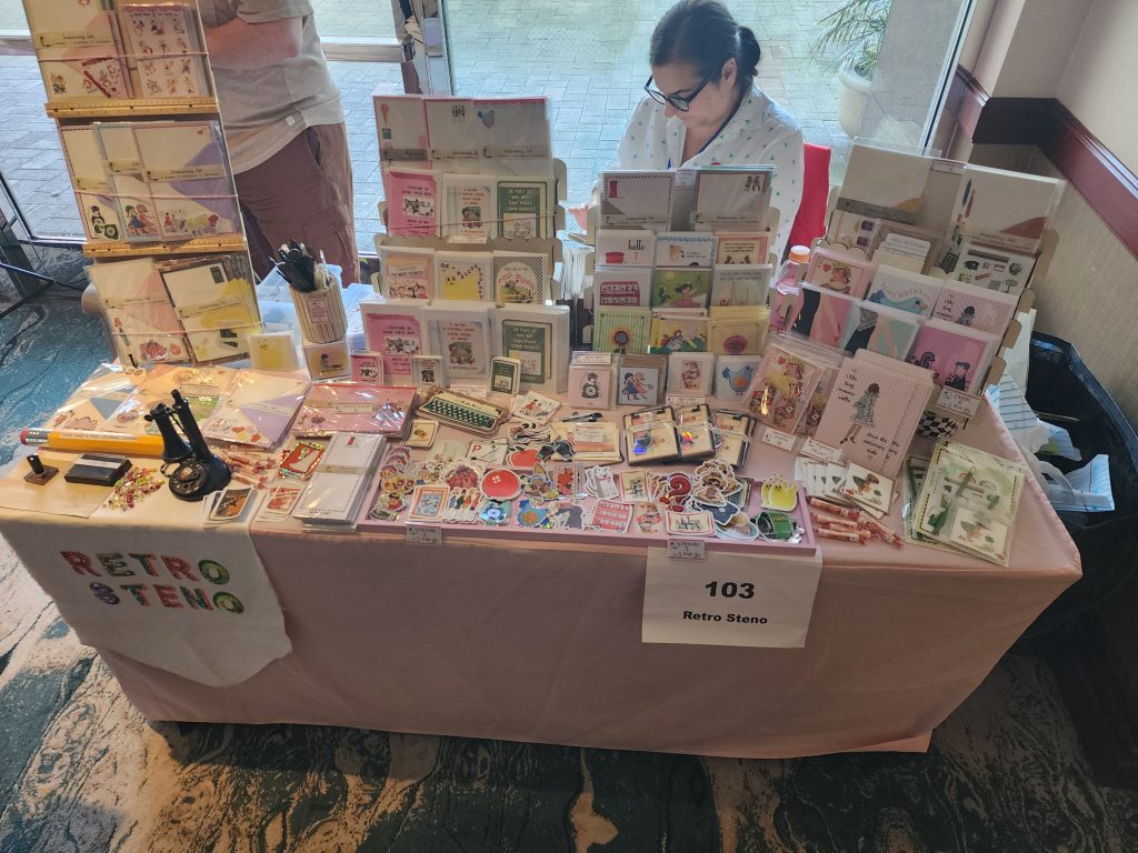My second stop was by Richsaw Bagworks; Mark is a great guy, and always fun to chat with. While they had a small selection of their normal pen cozies, the main focus was on a new release – the Pixel Pouch. It is a small pouch that perfectly fits a Simply Mints tin inside, comes with a pin, stickers and a googly-eyed card. They were also selling some of Marks new notecards, which were of particular interest to me! I have been experimenting with a variety of notecards to find some good ones, and I am always keen on adding a new item to the mix. I also got to chat for a short bit with Cheryl Ball, who ran the bookbinding classes at last years Pen Show, and was running some again at SF SF. I highly recommend them if you’re able to!